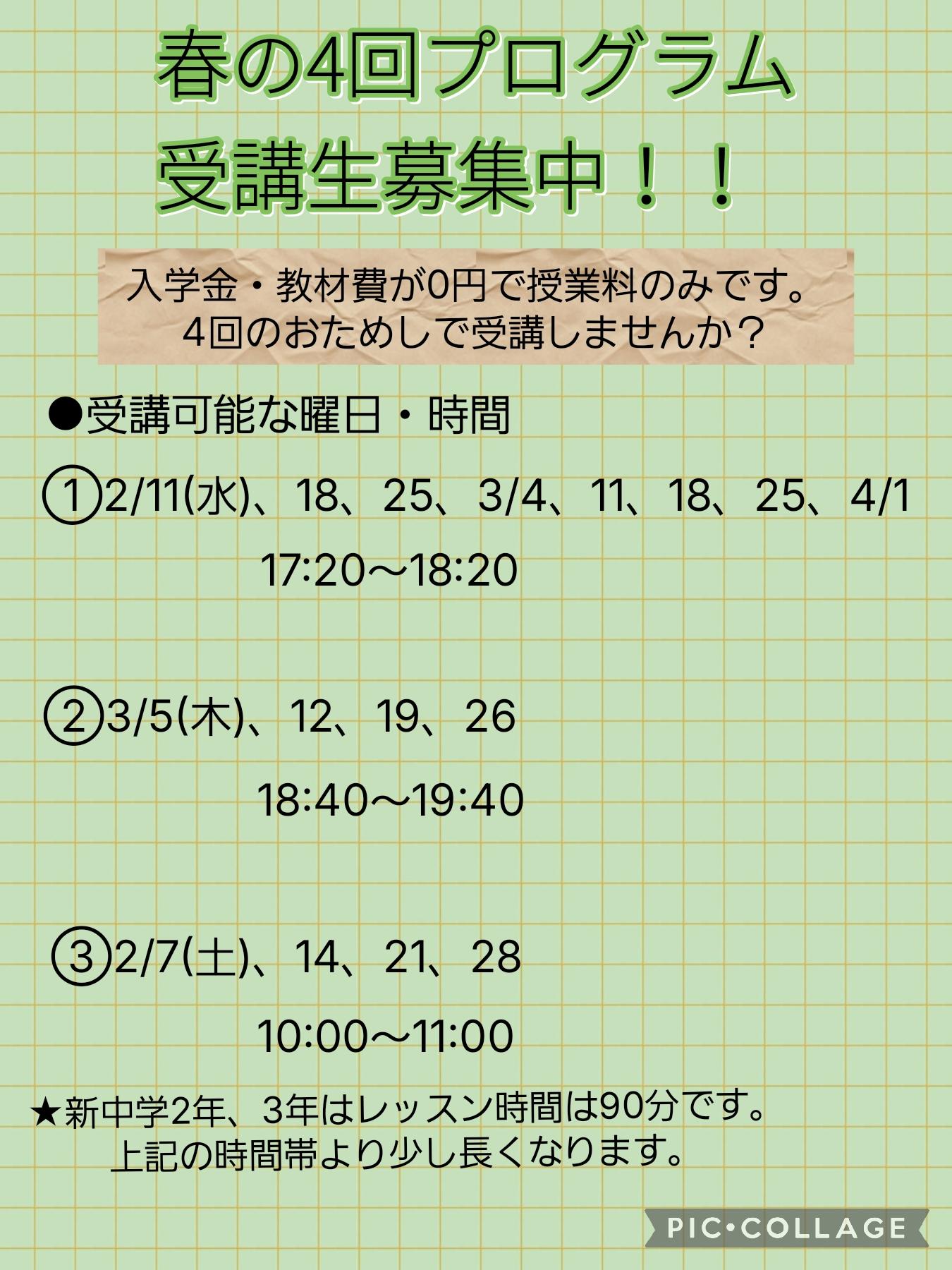 中学英語強化コース 英語の基礎力強化、高校入試突破を可能にする実力を養成します。 学校の英語の教科書の完全マスターを目指します。 将来にわたって必要な英語の土台づくりのためのコースです。 お気軽に見学、体験に来てくださいね。 対象:新中学2年生 水曜日 19:00~20:30 |